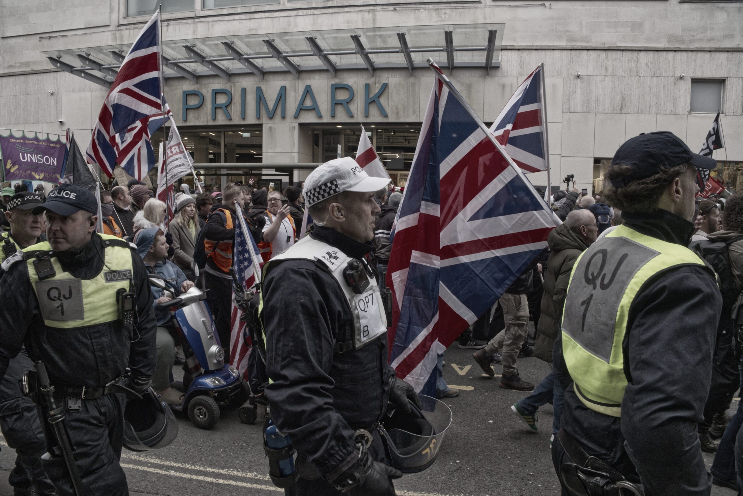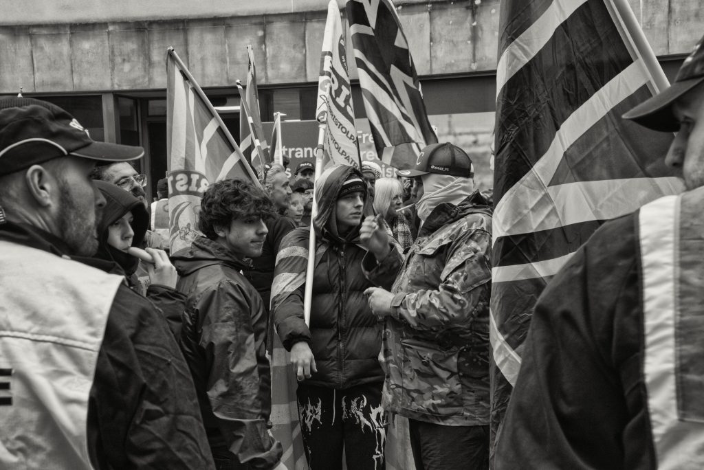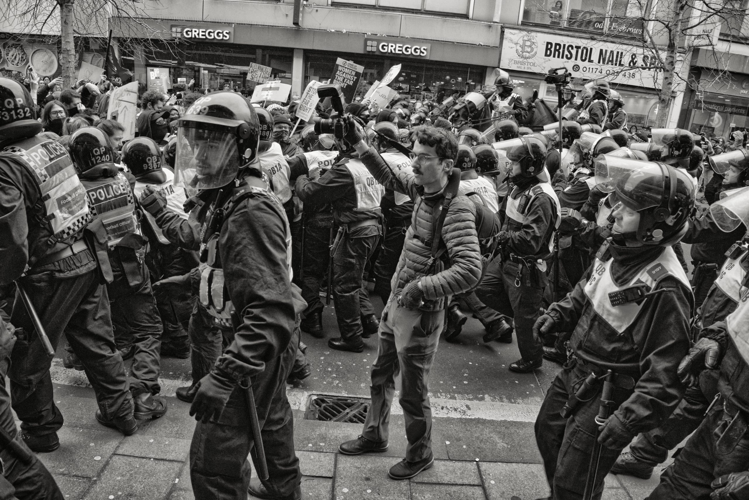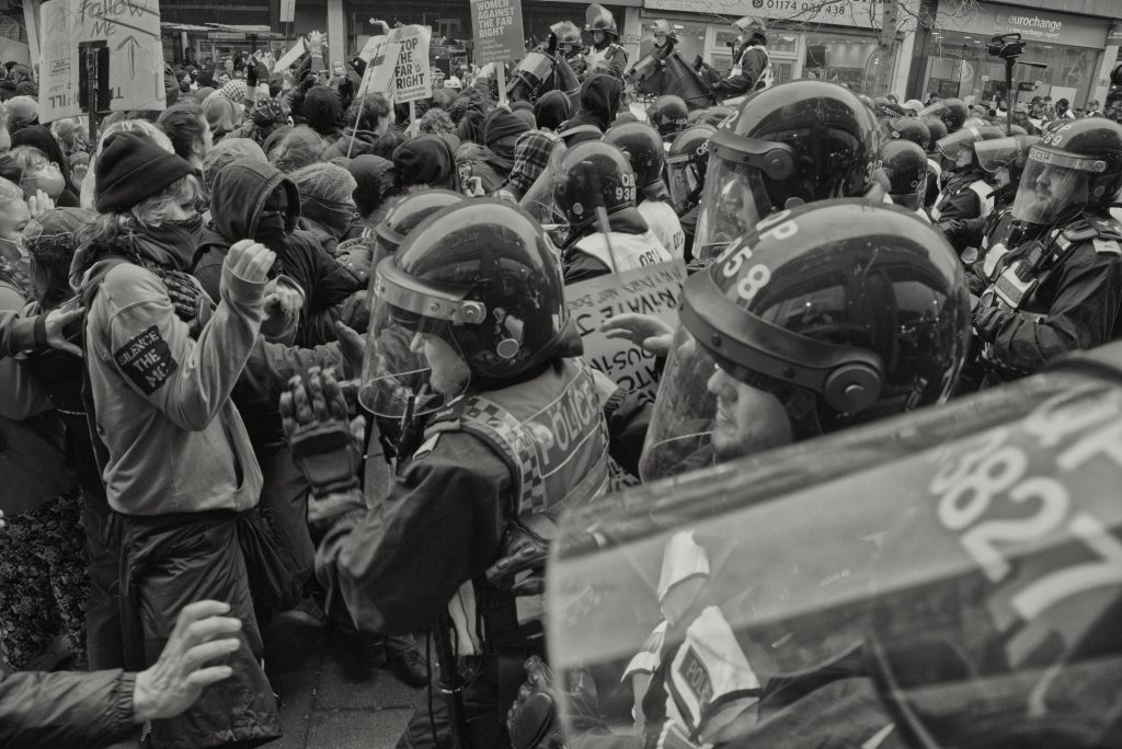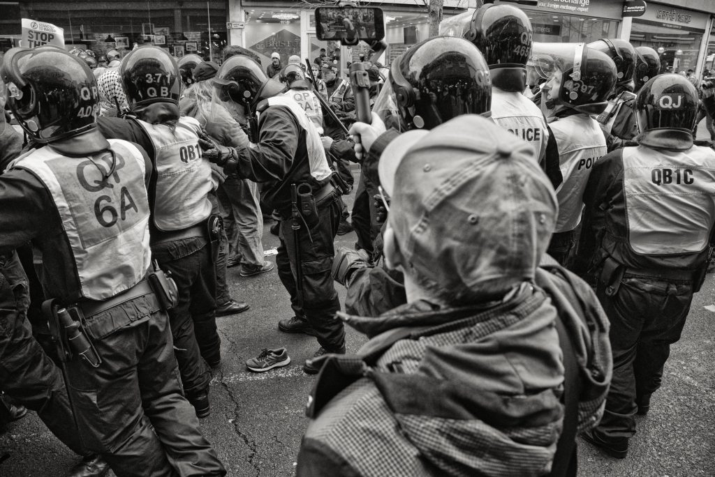 For documentary photographers, the scene offered a stark portrait of a city caught between competing ideologies: banners, chants, police lines, and uneasy standoffs unfolding across Bristol’s streets. The day became less about the march itself and more about the charged space between opposing crowds, where protest, counter-protest, and public order collided in a tightly controlled but volatile urban theatre.