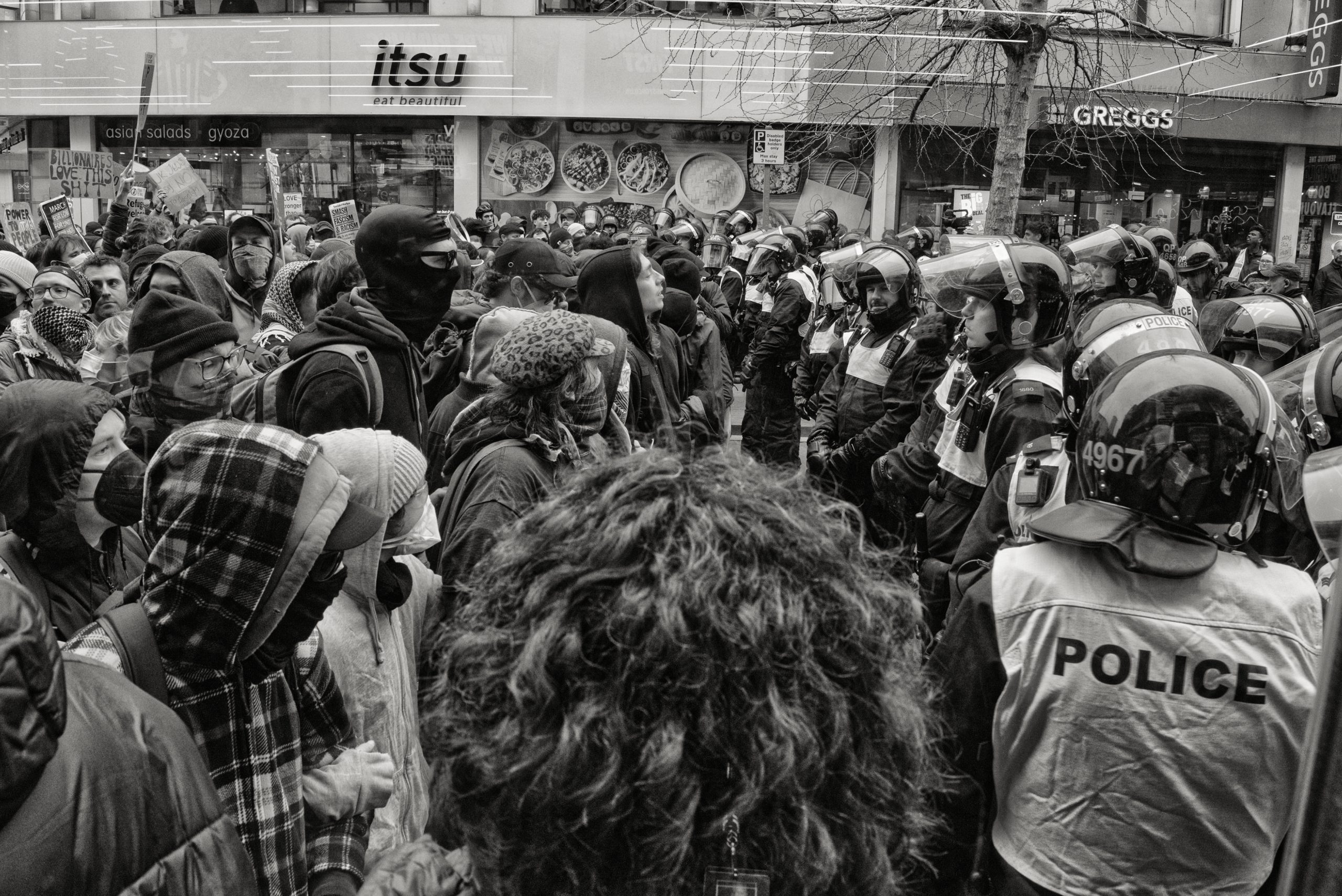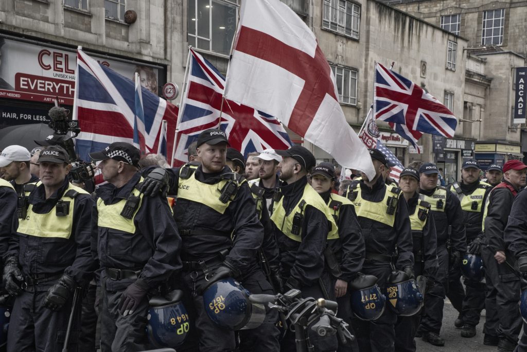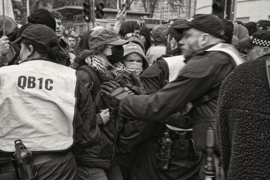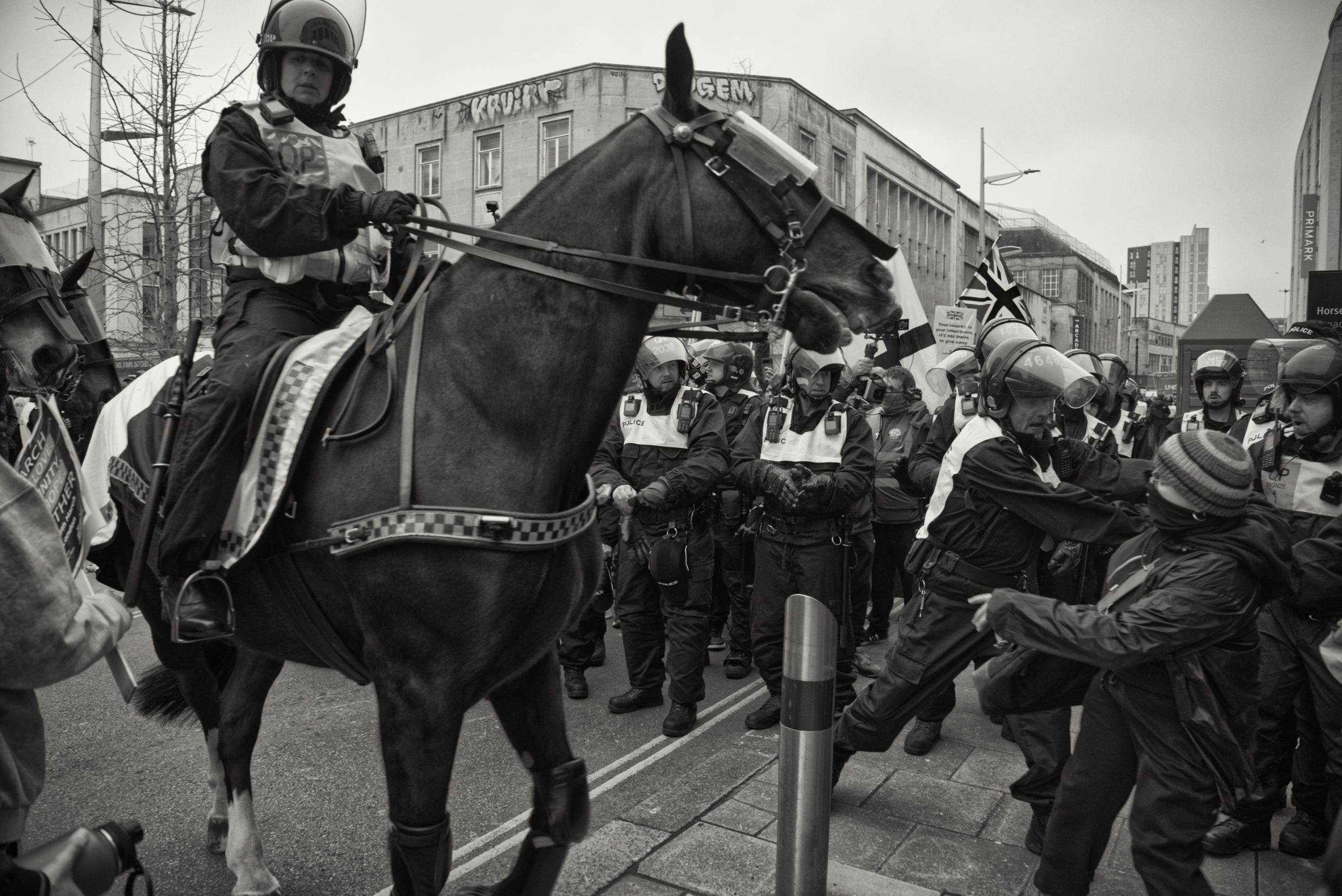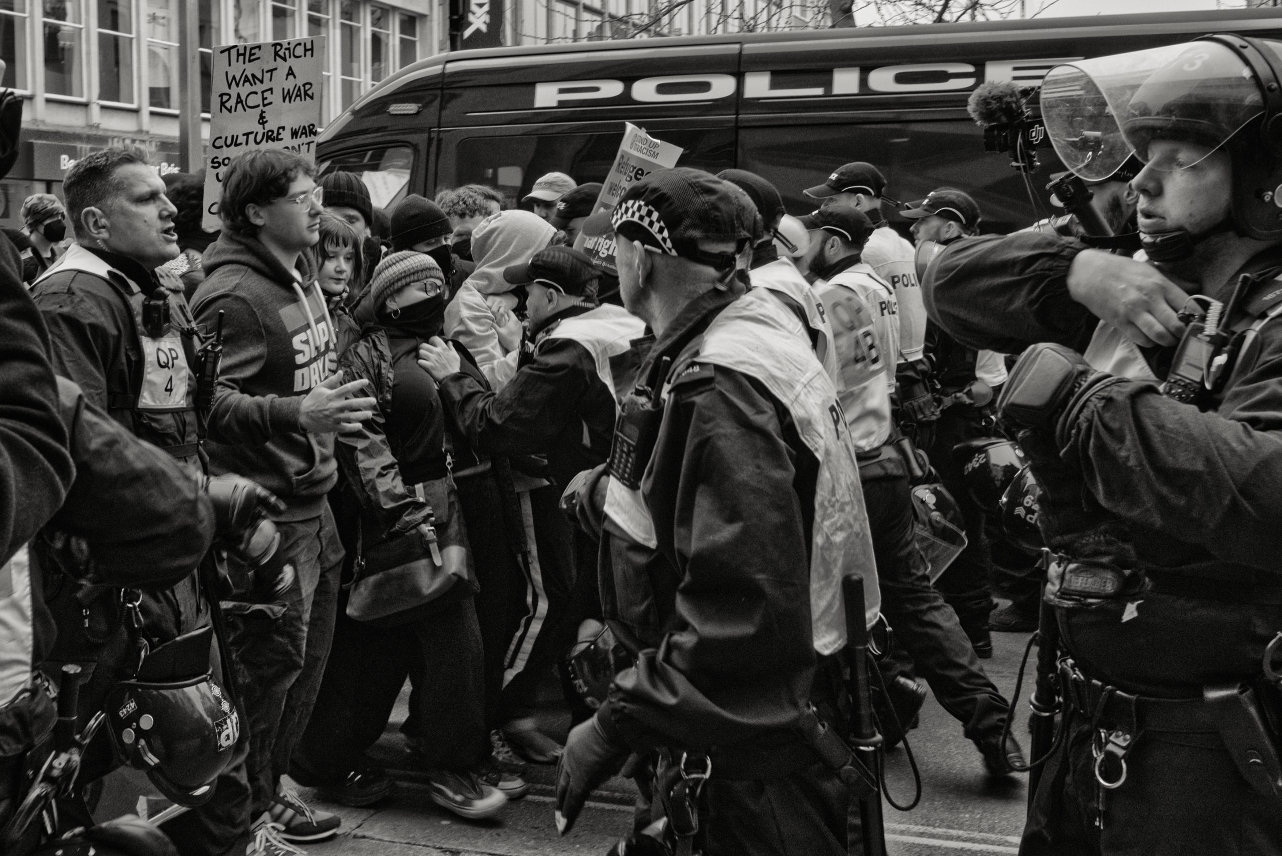 For documentary photographers, the scene offered a stark portrait of a city caught between competing ideologies: banners, chants, police lines, and uneasy standoffs unfolding across Bristol’s streets. The day became less about the march itself and more about the charged space between opposing crowds, where protest, counter-protest, and public order collided in a tightly controlled but volatile urban theatre.