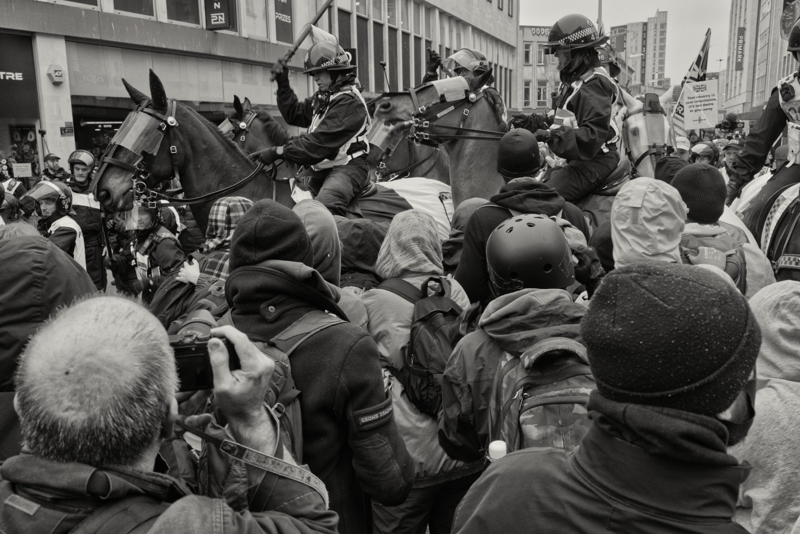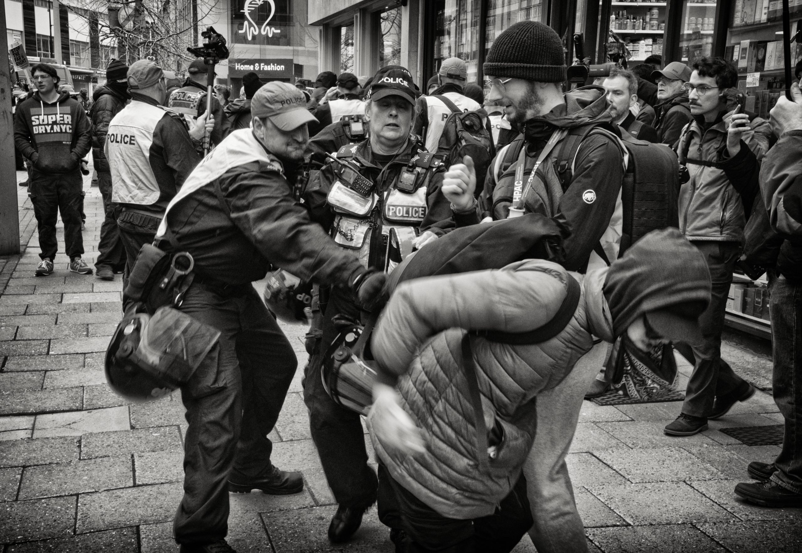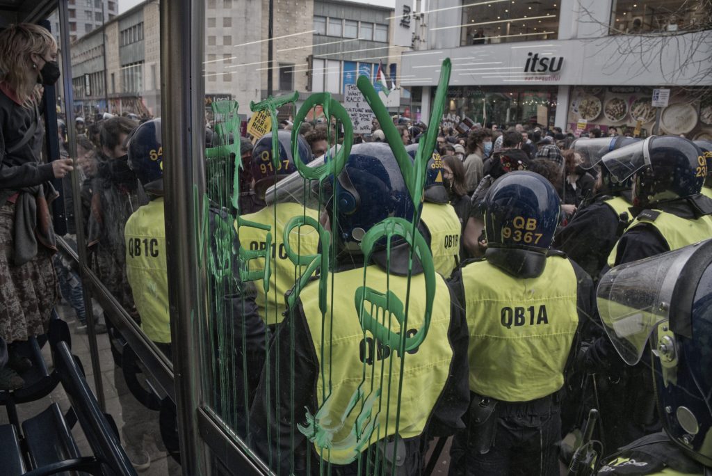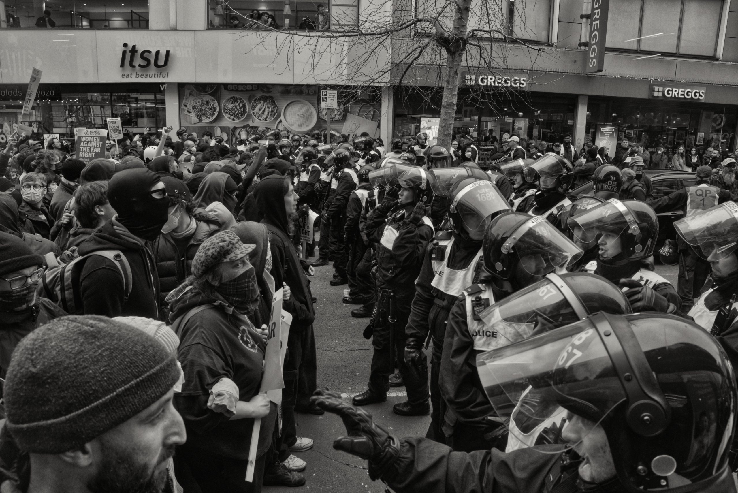 For documentary photographers, the scene offered a stark portrait of a city caught between competing ideologies: banners, chants, police lines, and uneasy standoffs unfolding across Bristol’s streets. The day became less about the march itself and more about the charged space between opposing crowds, where protest, counter-protest, and public order collided in a tightly controlled but volatile urban theatre.