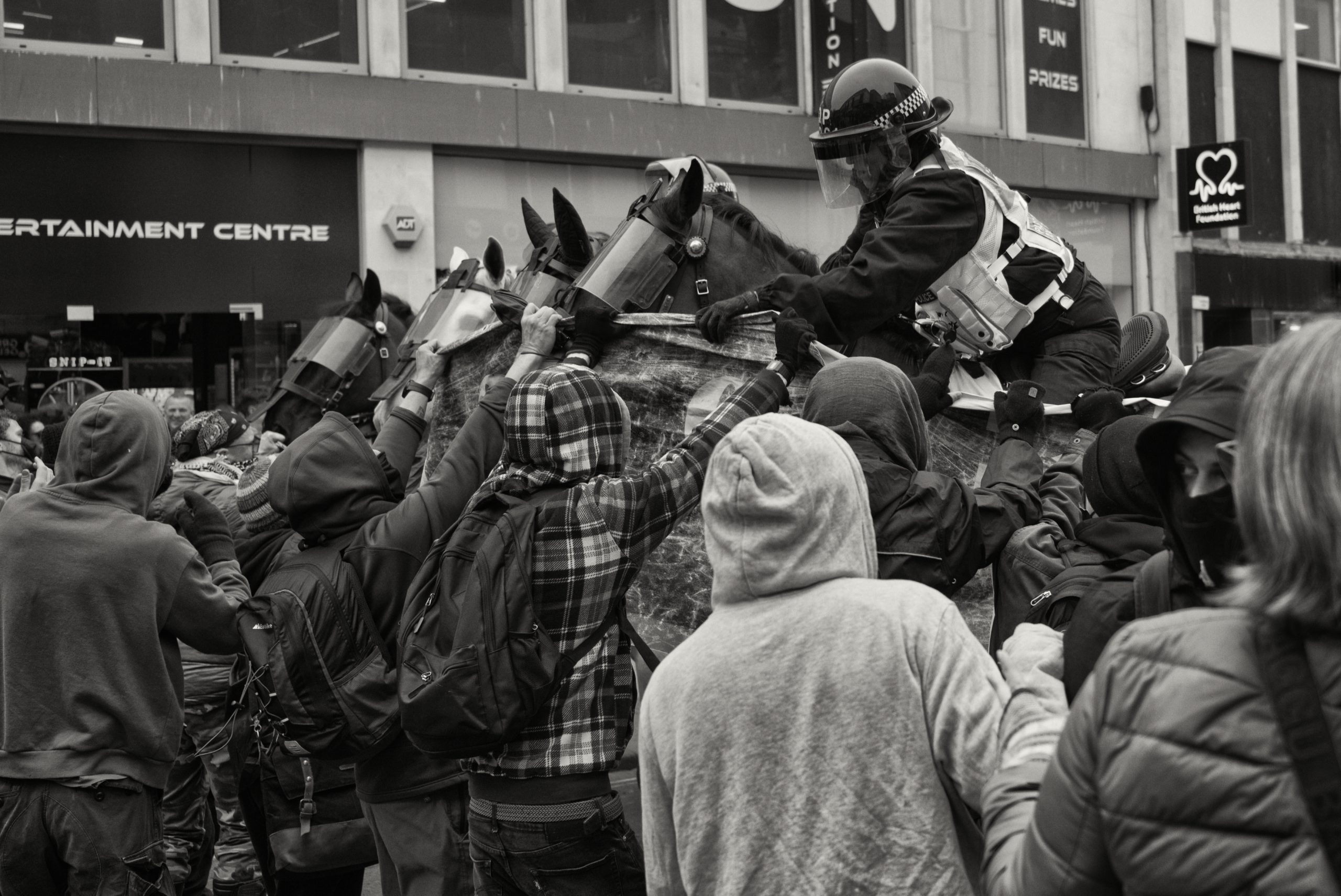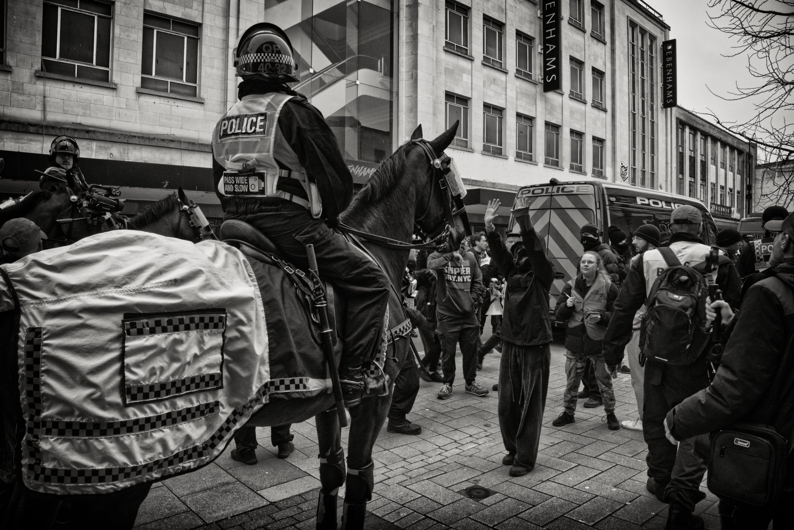A substantial police presence attempted to keep the groups apart. Lines of officers, reinforced by mounted police, formed moving barriers between the demonstrators and their opponents. At several moments the tension threatened to spill over, but the police cordons—particularly the wall of horse-mounted officers—prevented the situation from descending into outright violence.
